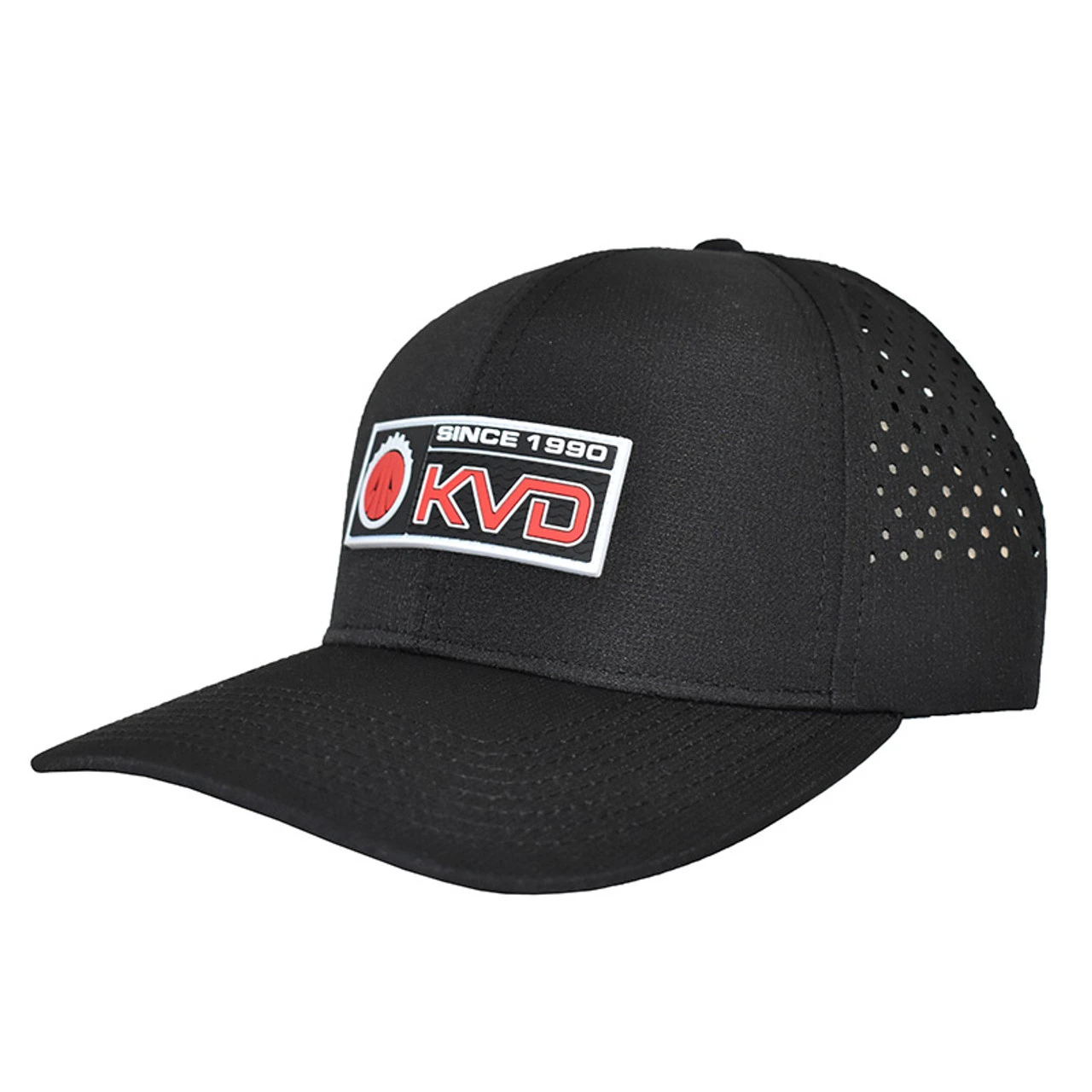 KVD cap features Kevin VanDam’s logo on rubber material. Mesh fabric hat with adjustable snap back closure.