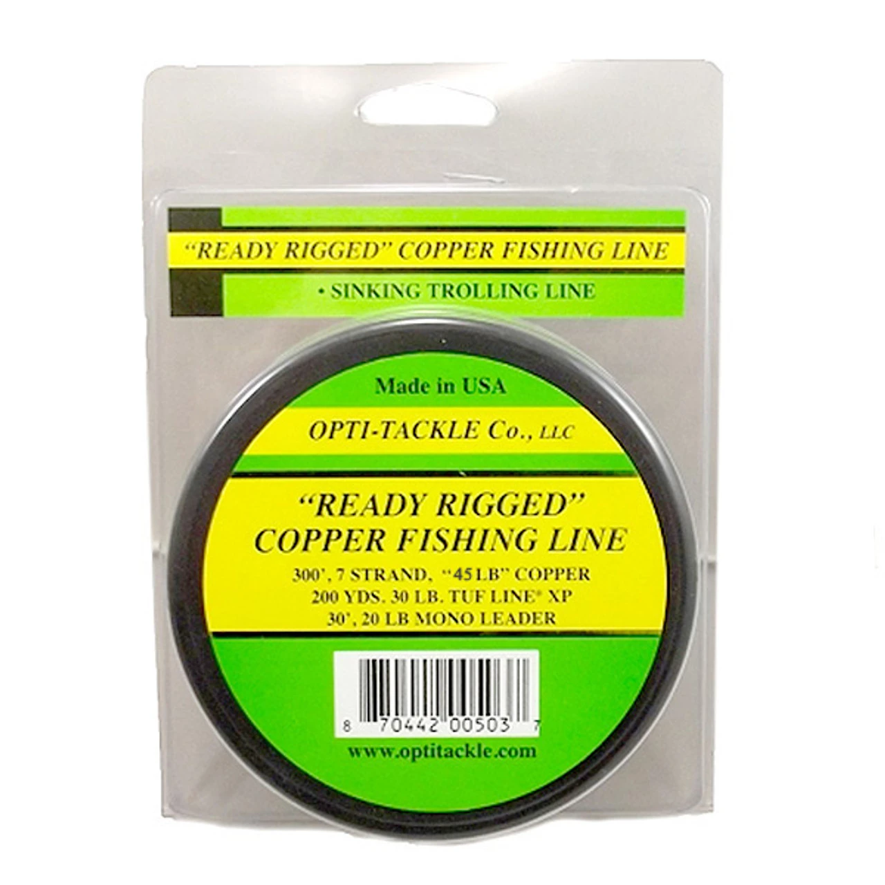Opti tackles “ready rigged” copper line is the easiest way to get into the copper line fishing craze. They’ve already done all the work for you! This “ready rigged” copper is ready to wind onto you reel and fish. Each spool contains 300 feet of 7 Strand 45 pound copper fishing line with 200 yards of 30 lb Tuf-Line XP braid and 30 feet of 20 lb monofilament leader.