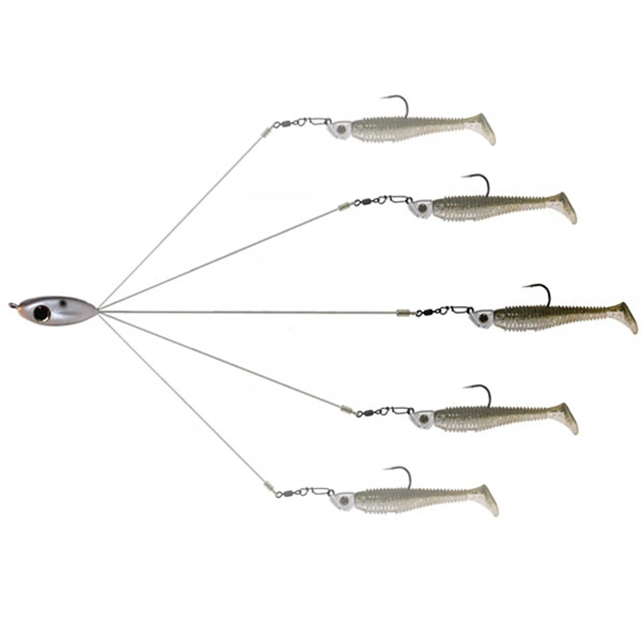 By leaving the slightly longer wire in the middle and spreading the rest of the wire an equal distance it forms a pattern that will now resemble a school of bait fish when rigged. The Picasso School-E-Rig can be cast and retrieved at a steady pace or allowed to fall through suspended schools of fish. The bait is very versatile and can be rigged with a wide variety of lures such as soft plastic swim baits, jig heads and small spinner baits. It can also be rigged with your favorite lures for bottom fishing such as Texas rigged worms, creature baits and jigs. Your imagination is the limit on the variety of techniques and lure presentations to be used which fish have not seen before. This product is Lead Free. Check with your state law regarding the legal use of this product since it is designed to fish up to 5 baits at a time.